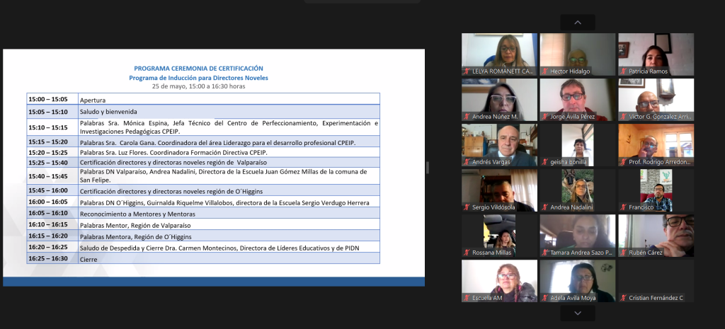 El día viernes 26 de mayo, se realizó de manera virtual la ceremonia de certificación del Programa de Inducción a Directores Noveles 2022-2023, junto al Centro de Perfeccionamiento, Experimentación e Investigaciones Pedagógicas (CPEIP) del Ministerio de Educación (MINEDUC) y el Centro Líderes Educativos PUCV.