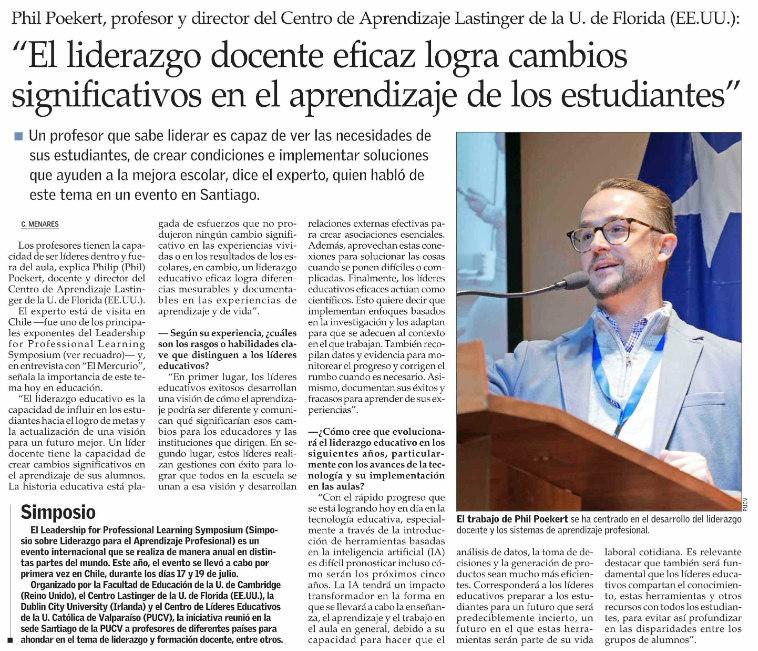 “El liderazgo docente eficaz logra cambios significativos en el aprendizaje de los estudiantes” – Phil Poekert, profesor y director del Centro de Aprendizaje Lastinger de la U. de Florida, EE.UU.