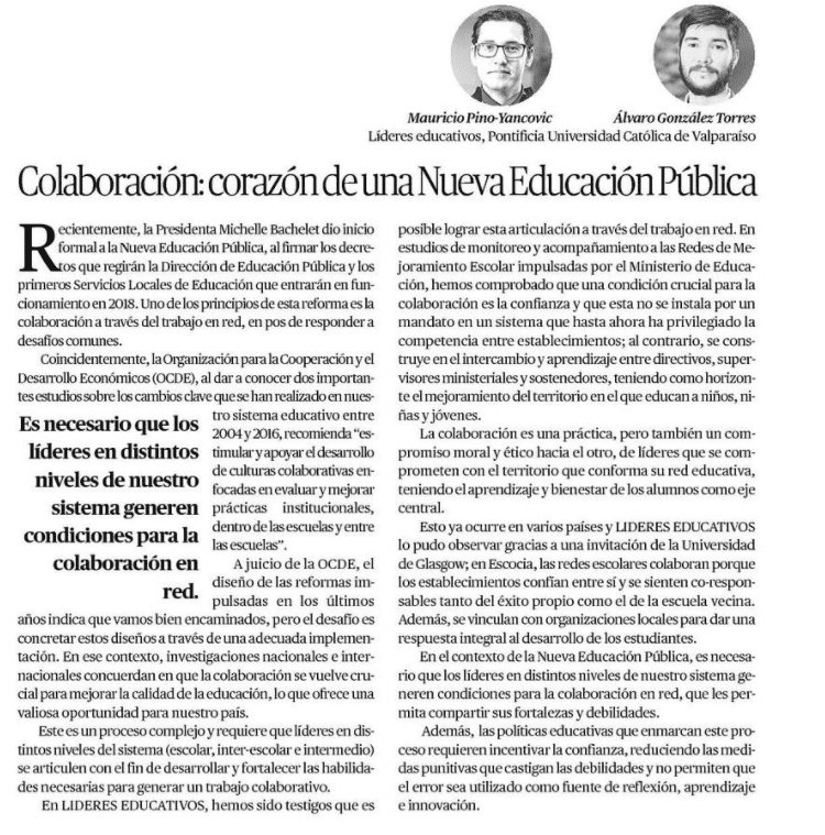El Mercurio de Valparaíso: “Colaboración: Corazón de una Nueva Educación Pública”