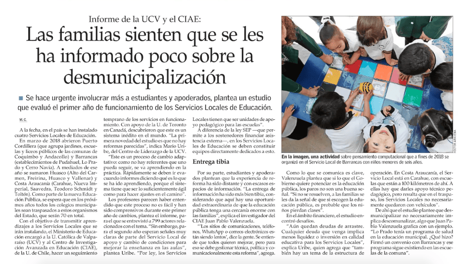 El Mercurio “Informe de la PUCV y CIAE: Las familias sienten que se les ha informado poco sobre la desmunicipalización”